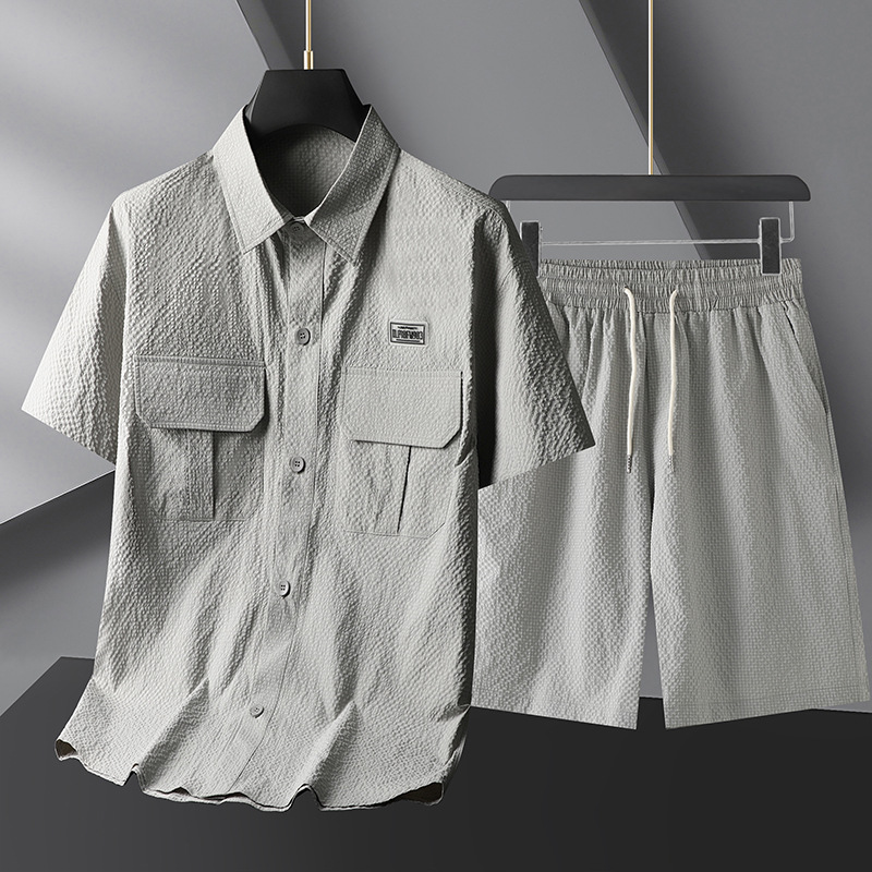 Con una textura nítida y arrugada y un corte relajado, este conjunto de dos piezas transmite la energía ideal para actividades al aire libre, con un estilo limpio y moderno. La camisa cuenta con bolsillos con solapa y un sutil detalle de insignia, mientras que los pantalones cortos con cordón le dan un toque minimalista y fresco.